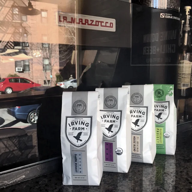 Aubergine Café has proudly been serving Irving Farm Coffee since we brewed our first cup in January 2003, we in fact had picked Irving Farm as our coffee roasters before we even found a home for the café! We can truly call Steve, David and all their staff our friends, sharing their philosophy of providing sustainably sourced coffee from around the world and a fair wage for all the growers.The beans are roasted in the Hudson Valley, to order and delivered weekly giving our customers the finest quality, freshest coffee which makes us very happy baristas!